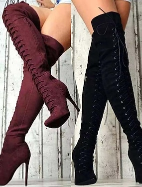 Overknee-Stiefel zum Schnüren für Damen – schwarze und burgunderfarbene, oberschenkelhohe Stilettos für die Wintermode und zum Ausgehen
