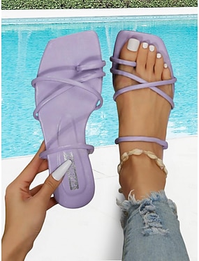 Lavendelfarbene Riemchensandalen für Damen – trendige flache Sandalen mit quadratischer Spitze für Sommer, Strand und Freizeitausflüge