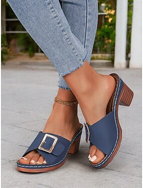 Blaue offene Pantoletten für Damen mit Blockabsatz und goldener Schnalle – stylische Sommerschuhe für legere Anlässe
