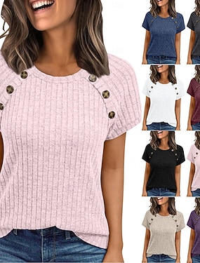 Damen T Shirt T-Shirt Knöpfe Einfach Mode Stilvoll Klassisch Kurzarm Rundhalsausschnitt Normale Oberteile Täglich Ausgehen Wochenende Blau Schwarz Weiß Rosa Aprikose Sommer Frühling