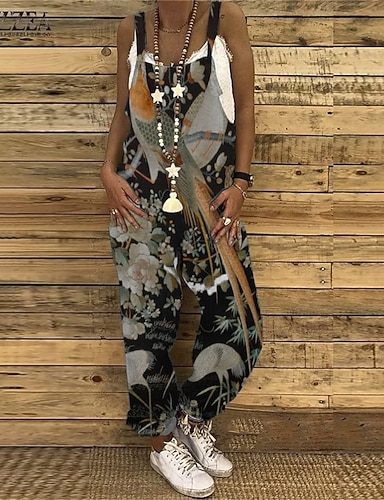 Damen Normal Overall Lässig Blumen Ärmellos U-Ausschnitt Druck Straße Ferien Normale Passform Dunkelgray Sommer