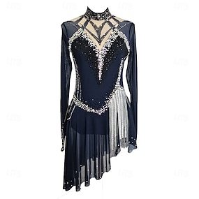 Eiskunstlaufkleid Damen Mädchen Eislaufen Kleid Dunkelmarine Offener Rücken Asymmetrischer Saum Netzstoff Hohe Elastizität Training Wettbewerb Eiskunstlaufkleidung Klassisch Kristall / Strass Langarm