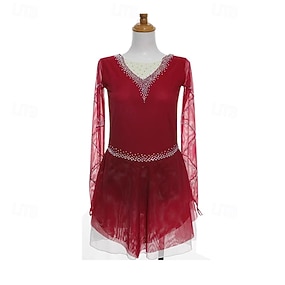 Eiskunstlaufkleid Damen Mädchen Eislaufen Kleid Burgund Patchwork Daumenloch Netzstoff Spandex Dehnbar Training Übung Professionell Eiskunstlaufkleidung Thermowarm Kristall / Strass Langarm Eislaufen