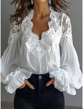 Damen Spitzenbluse Bluse Spitze Patchwork Einfarbig Elegant Stilvoll Basic Langarm V Ausschnitt Normale Oberteile Täglich Ausgehen Schwarz Weiß Sommer Frühling Herbst