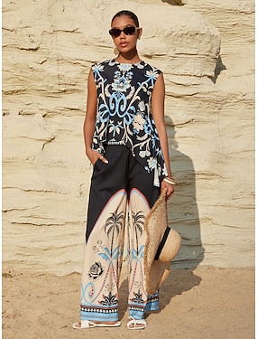 Damen Weiblich Freizeithemd Baum Tropisch Palmblatt Lässig Strandurlaub Ärmellos Marineblau Drucken Ärmellos Elegant Bohemien Urlaub Wasserfallausschnitt Sommer