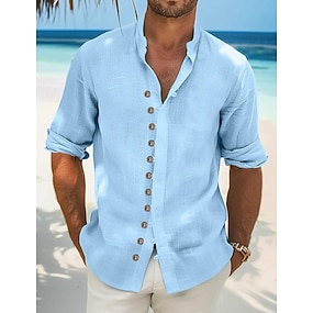 Herren Hemd Leinenhemd Sommerhemd Strandbekleidung Freizeithemd Knopfhemd Einfach Urlaub Kreuzfahrt Schwarz Weiß Hellgrün Rosa Langarm Stehkragen Frühling & Sommer Bekleidung
