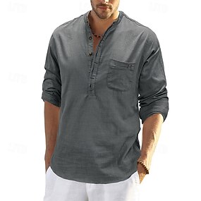 Herren Hemd Leinenhemd Popover-Hemd Sommerhemd Strandbekleidung Stehkragenhemd Einfach Lässig Täglich Schwarz Weiß Marineblau Grün Langarm Stehkragen Sommer Frühling Bekleidung Tasche