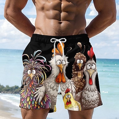Herren Tiermotiv Cartoon Frizzle Chickens Badehosen Badeshorts Boardshorts Mittlere Taille Lustig Outdoor Urlaub Seitentaschen Netzfutter Elastischer Kordelzug in der Taille Designer Bekleidung