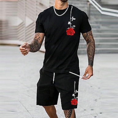 Herren Text / Nummer Rose 2St T-Shirts-Sets Sommer-Set Kurzarm Kurze Hosen Rundhalsausschnitt Sport Lässig Outdoor Urlaub Sport 3D-Druck Sommer Schwarz