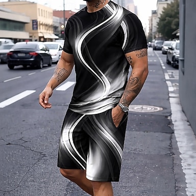 Herren Grafik 2St T-Shirts-Sets Sommeroberteile Kurzarm Kurze Hosen Rundhalsausschnitt Alltagstauglich Outdoor Sport Täglich 3D-Druck Sommer Schwarz