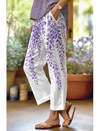 Damen Leinenartige Chinos Urlaub Vintage Lässig Knöchellang Hohe Taille Floral Grafik Tasche Weich Outdoor Atmungsaktiv Unelastisch Lässig Alltag Outdoor Weiß Grün Flieder Sommer Frühling Herbst