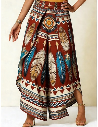 Damen Weites Bein Hosen Hose Freizeithose Urlaub Lässig Boho Volle Länge Mittlere Taillenlinie Grafik Feder Geschichtet Asymmetrisch Komfort Weich Bequem Unelastisch Täglich Outdoor Urlaub Weinrot