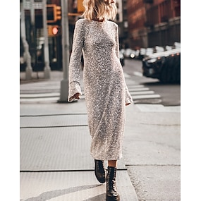 Damen Midikleid Weißes Kleid Paillettenkleid Partykleid Mode Modern Abendgesellschaft Party Besonderer Anlass Normale Passform Einfach Langarm Rundhalsausschnitt Silber Herbst Winter