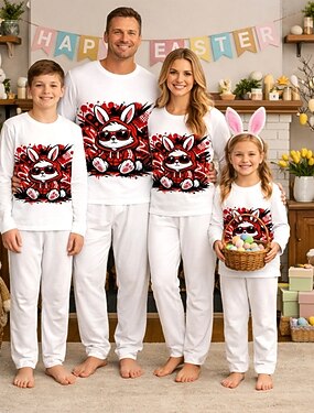 Familie Ostern Schlafanzug Grafik Hase Lässig Druck Weiß Dunkelrot Rote Langarm Urlaub Passende Outfits