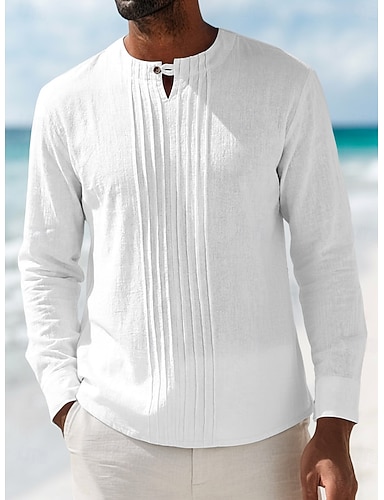 Herren Hemd Leinenhemd Sommerhemd Strandhemd Einfarbig Urlaub Ferien Blau Schwarz Weiß Khaki Langarm Mandarinkragen Frühling & Sommer Bekleidung Gerafft