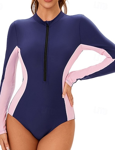 Damen Anti UV Shirt Badeanzug Einteilige Patchwork Reißverschluss Spandex UV Schutz Hohe Elastizität Langarm Bademode Surfen Tauchen Schnorcheln Sommer