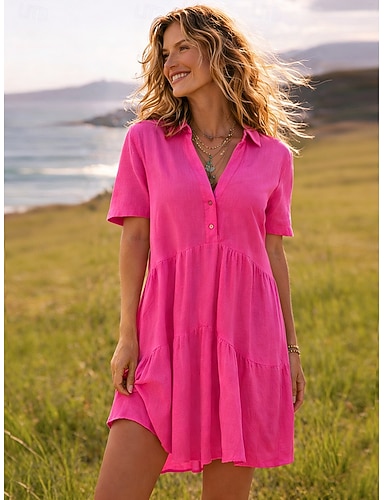 Damen Minikleid Kunstbaumwollleinen Hemdblusenkleid Freizeitkleid Stilvoll Lässig Täglich Urlaub Date Normale Passform Einfach Kurzarm Revers Gelb Rosa Rote Sommer