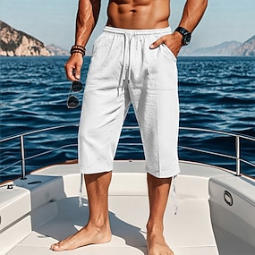 Herren Leinenhosen Caprihose Sommerhose Strandshorts Kordelzug Elastischer Bund Fronttasche Einfarbig Einfach Atmungsaktiv Wadenlang Täglich Ausgehen Urlaub Stilvoll Blau Schwarz Unelastisch