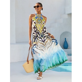 Maxikleid aus Satin mit blauem Pinselstrichmuster, lässig, für Urlaub und Reisen