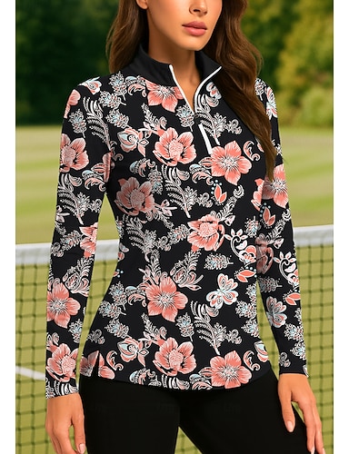 Damen Blumenmuster Golf-Poloshirt Tennis Shirt Tennis-Sweatshirt Langarm Druck Viertel Postleitzahl Pullover UV Schutz Elastisch Atmungsaktiv Tennis Golfspiel Pickleball Stehkragen