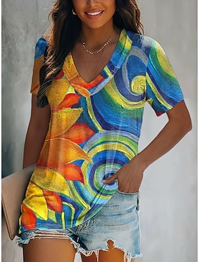 Damen T Shirt Druck Blumen Farbblock Vintage Lässig Boho Kurzarm V Ausschnitt Normale Oberteile Täglich Regenbogen Sommer Frühling