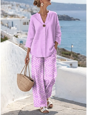 Damen Zweiteilige Sets Leinenartige Hosen Sets Bolero Top 3/4-Ärmel V-Ausschnitt Grafik Geometrischer Druck Alltag Stilvoll Lässig Alltag Strand Pink Blau Grün Sommer Lockere Passform