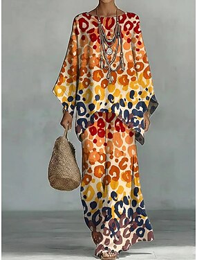 Damen Kleid-Set Freizeitkleid Rock-Set Lässig Leopard Druck Maxikleid Dreiviertelarm V Ausschnitt Täglich Outdoor Fuchsie Sommer Frühling Normale Passform