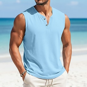 Herren Henley Hemd Weste Tanktop aus Leinen Ärmellos Henley Sommer Einfach Mode Designer Böhmische Knöpfe Rohkante Lässig Urlaub Ausgehen Weiß Rosa Marineblau Top T-Shirt für Herren