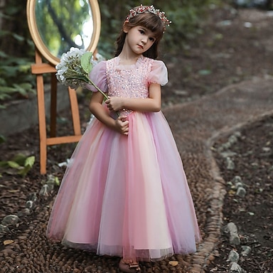 Blumenmädchenkleid Mädchen Formelle Kleidung Hochzeitskleidung Party Hochzeit Formell Niedlich Prinzessin Schön Patchwork Netz Einfarbig Kurze Ärmel Rundhalsausschnitt Champagner Rosa Ab 4 Jahren