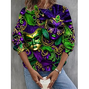 Mardi Gras Womens Bluse Leinenähnlich Atmungsaktiv Leicht Grafik Vintage Täglich Stylisch Lange Ärmel V-Ausschnitt Lange Oberteile Täglich Urlaub Druck Weiß Helllila Lila Sommer Frühling