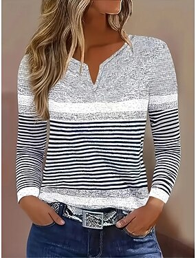 Damen T Shirt Druck Grafik Geometrisch Gestreift Vintage Stilvoll Klassisch Langarm V Ausschnitt Einkerbiger Ausschnitt Normale Oberteile Täglich Wochenende Schwarz und weiss Staubiges Blau Grau