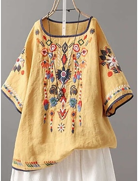 Damen Bluse Blumen Bohemien Basic Lässig Halbarm Rundhalsausschnitt Normale Oberteile Täglich Bestickt Weiß Gelb Rote Sommer