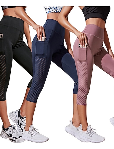 Damen Yogahose Seitentaschen Po-Lifting Bauchkontrolle Hohe Taille Pilates Fitnesstraining Laufen Capri Leggings Unterteile Einfarbig Schwarz Rosa Dunkelmarine Spandex Netzstoff Herbst Sport