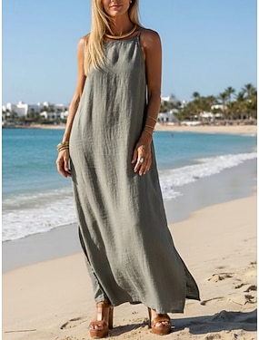 Damen Maxikleid Kunstbaumwollleinen Shiftkleid Sommerkleid Unterkleid Lässig Täglich Lässiger Schnitt Einfach Ärmellos Spaghettiträger Grün Sommer