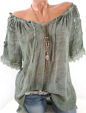 Damen Hemd Bluse Kunstbaumwollleinen Patchwork Einfarbig Stilvoll Klassisch Modern Kurzarm Schulterfrei Normale Oberteile Täglich Ferien Ausgehen Weiß Gelb Armeegrün Rote Königsblau Sommer Frühling