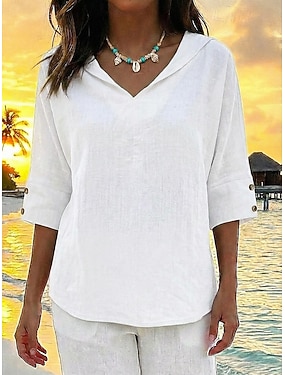 Damen Bluse Hemd aus Leinenimitat Knöpfe Einfarbig Täglich Stilvoll Basic Halbarm V Ausschnitt Normale Oberteile Täglich Blau Schwarz Gelb Rote Purpur Sommer Frühling Herbst