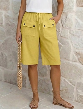 Damen Caprihose Shorts Leinenshorts Schicke Shorts Mode Basic Formell Knielang Mittlere Taillenlinie Einfach Tasche Elastischer Bund Gerader Schnitt Leicht Bequem Atmungsaktiv Unelastisch Täglich