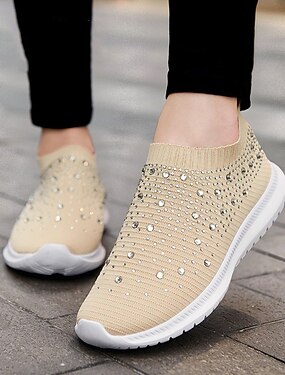 Beige Flyknit Slip-On-Komfort-Sneaker für Damen – leichte, atmungsaktive Laufschuhe für den Park, Besorgungen und den Alltag