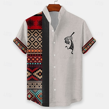 Herren Ethnisch Kokopelli Hemd Knopfhemd Kurzarm Lässig Tribal Urlaub Täglich Sommer Frühling Großvaterkragen Stehkragen Knöpfe Druck Rosa Blau Grün Khaki Beige