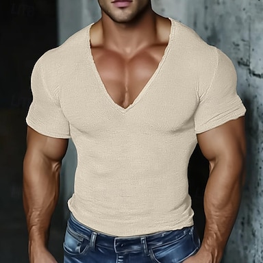 Herren T Shirt Strick-T-Shirt T-Shirt Kurzarm V Ausschnitt Sommer Einfarbig Mode Designer Basic Gestrickt Urlaub Straße Lässig Hellblau Gelb Beige Top T-Shirt für Herren