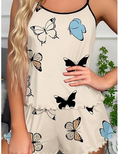 Damen Schlafanzug Set Lässig Komfort Schmetterling Elastischer Bund Shorts Täglich Heim Ärmellos Träger Blau Rosa Beige Sommer Frühling Normale Passform