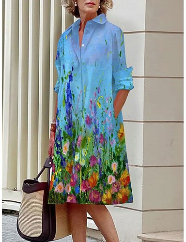Damen Minikleid Hemdblusenkleid Freizeitkleid Sommerkleid Mode Täglich Urlaub Wochenende Normale Passform Blumen Langarm Hemdkragen Blau wasserblau Rosa Dunkelgrün Sommer