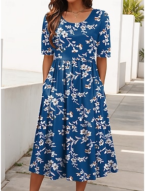 Damen Midikleid Shiftkleid Urlaub Lässig Outdoor Ausgehen Lässiger Schnitt Blumen Halbarm Rundhalsausschnitt Blau Hellblau Schwarz Sommer Frühling Herbst
