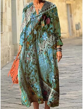 Damen Maxikleid Boho-Kleid Freizeitkleid Druckkleid Vintage Outdoor Urlaub Wochenende Lässiger Schnitt Blumen Grafik Batik Langarm V Ausschnitt Blau Purpur Grün Sommer Frühling Herbst