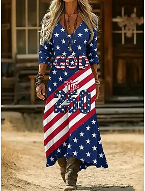 Unabhängigkeitstag Patriotisches Damen Midi Kleid Schlichtes Kleid Party Freizeit Boho Date Reguläre Passform Grafik Flagge Lange Ärmel V-Ausschnitt Blau Sommer Frühling Herbst Winter