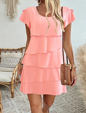 Damen Blau Schwarz Rosa Sommer Frühling Herbst Minikleid A Linie Kleid Rüschenkleid Urlaub Formell Halbformelle Kleider Täglich Büro Hochzeit Normale Passform Rundhalsausschnitt