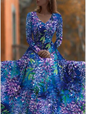 Damen Maxikleid Faltenkleid Party Lässig Boho Täglich Date Ausgehen Normale Passform Blumen Grafik Blatt Langarm V Ausschnitt Blau Violett Dunkelblau Sommer Frühling Herbst