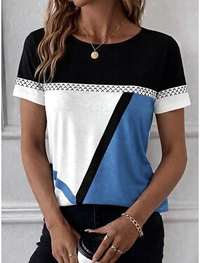 Damen T Shirt Farbblock Viertel Postleitzahl Grafik Geometrisch Tropisch Hawaiianisch Stilvoll Kurzarm Rundhalsausschnitt Normale Oberteile Strandhochzeit Täglich Sport Blau Sommer Frühling