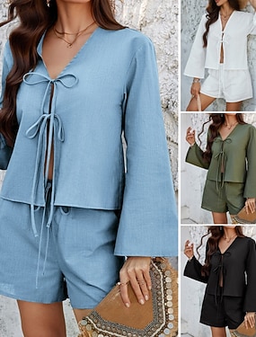 Damen Aktiv Mode Bluse Shorts-Sets Langarm V Ausschnitt Einfarbig Schnürung Täglich Alltagstauglich Schwarz Weiß Armeegrün Sommer Normale Passform