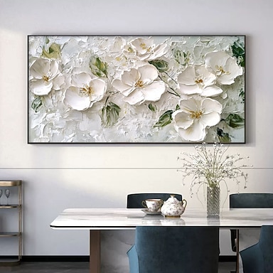 handgemachtes original weißes Blumenölgemälde auf Leinwand, abstraktes Blumengemälde für Wohndekoration mit gespanntem Rahmen/ohne Innenrahmen